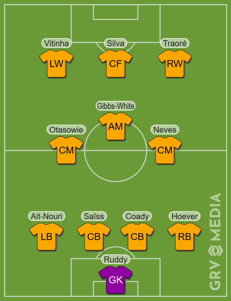 On the right, Adama Traore may keep his place in the absence of the injured Daniel Podence, with the Spaniard needing a chance to improve his form, and up top, Fabio Silva could start if the returning Patrick Cutrone does not receive international clearance in time.